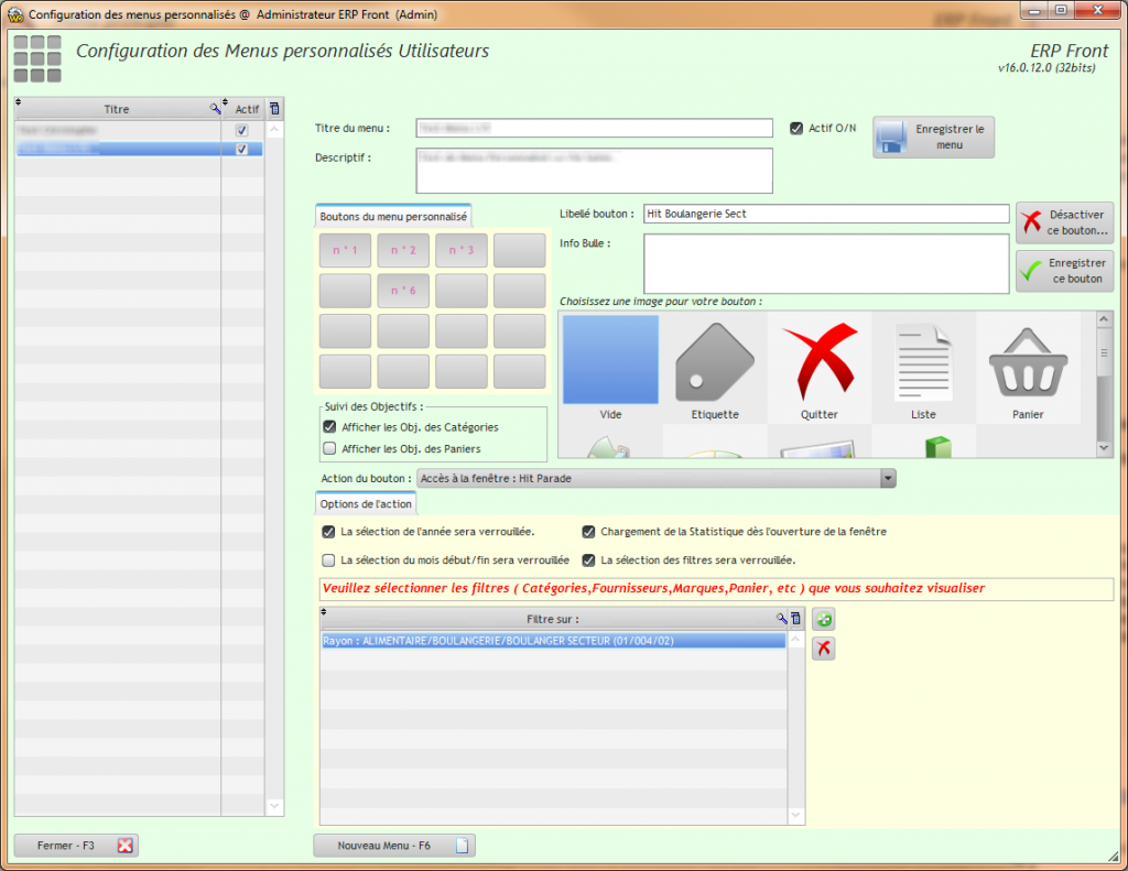 Permet par exemple, de créer un menu personnalisé pour chacun de vos responsables de Rayon, en leur confectionnant plusieurs boutons d’accès direct aux diverses statistiques les concernant.