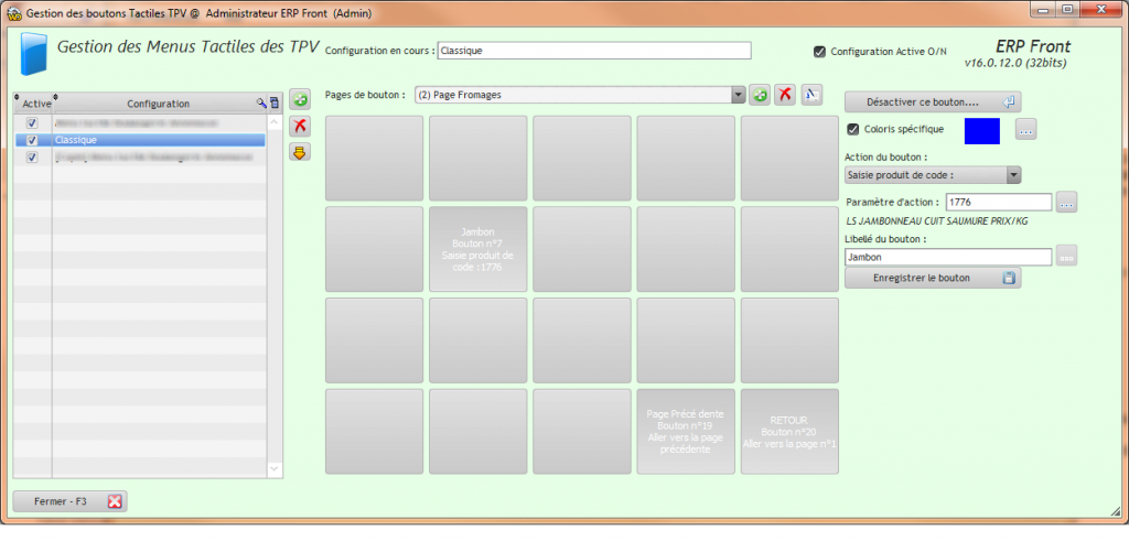La caisse possède deux rangées de boutons paramétrables. Il existe également la possibilité d’appeler une page avec 72 boutons en pleine page. Tout ceci se paramètre depuis ce menu. Chaque bouton aura une action, une couleur, un libellé. Il est ainsi possible de créer différentes configurations que l’on utilisera à volonté sur chaque caisse selon l’usage. On peut ainsi préparer une caisse boucherie, boulangerie …